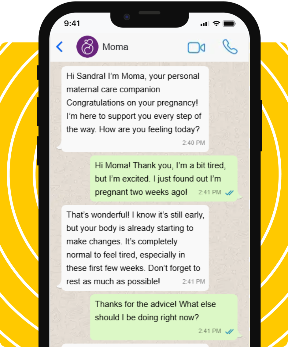 With Moma, our AI-powered personal maternal care companion on WhatsApp, help is always just a message away — no apps, no stress, no waiting rooms. Just open WhatsApp and Moma is there for you