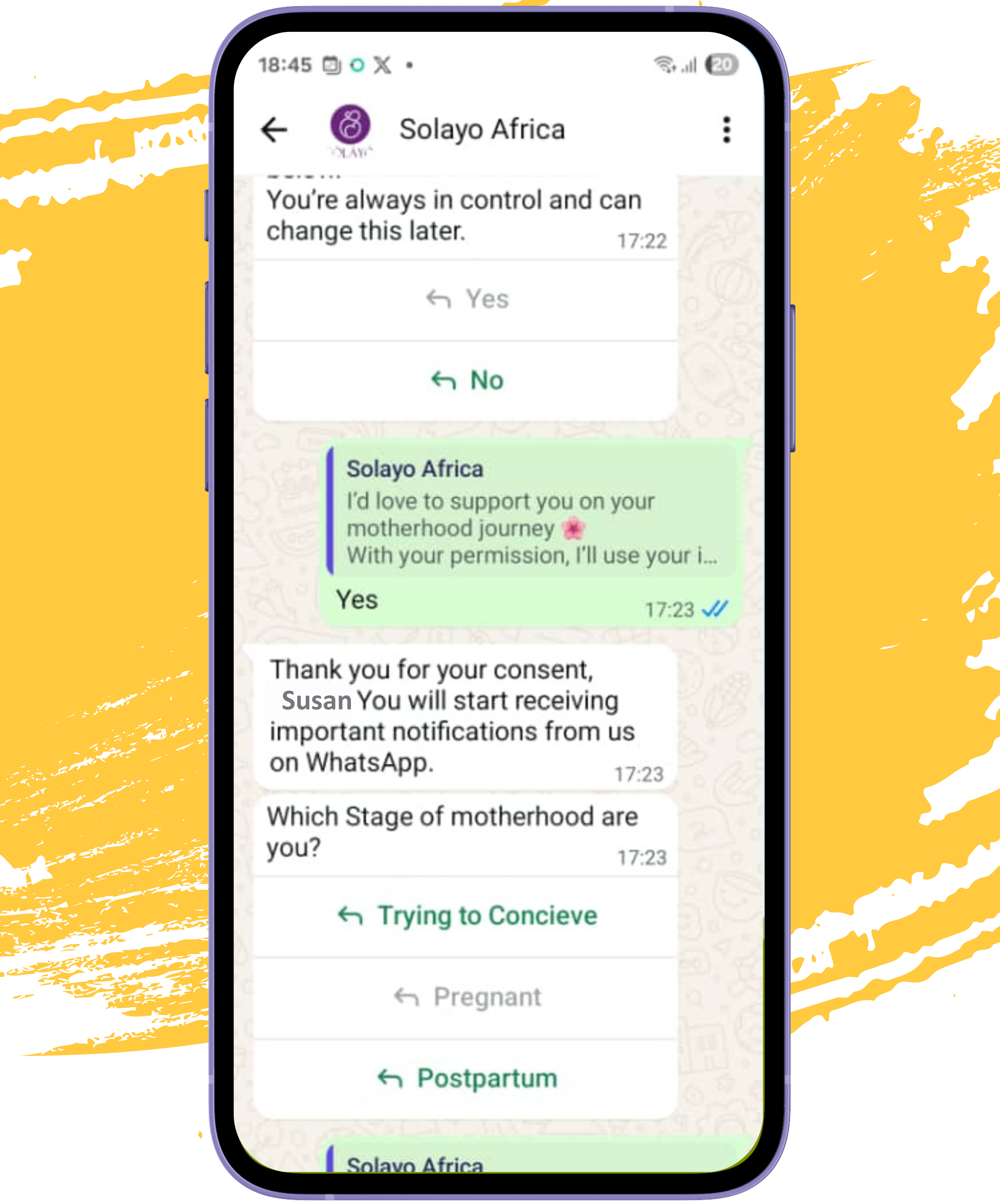 Using Solayo is simple! Just save our WhatsApp number or click on the link, send “Hello” to start a conversation, and answer a few quick questions about your pregnancy or motherhood stage. Solayo will then offer personalized support based on your unique needs.
